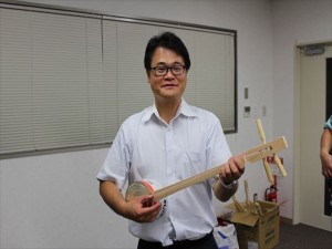 伊藤委員長(中)と、湯之原貴夫副理事長(左から2番目)。缶詰の缶が見えると思います。カンカラ三線は、沖縄で、戦中、捕虜になっていた方が、アメリカ兵が食べた缶詰の空き缶と、壊れたベッドの廃材と、パラシュートのひもで、手作りで三線を作り、演奏したことに由来するものです。それを聞いたアメリカ兵も、感激したのか、一緒に音楽を演奏したのだそうです。戦争は、悲劇でした。しかし、そこからの復興に、手作りのこの三線が貢献したのです。そして、この三線は「カンカラ三線」と呼ばれるようになり、平和を取り戻した沖縄において、平和のシンボルとなったのです。